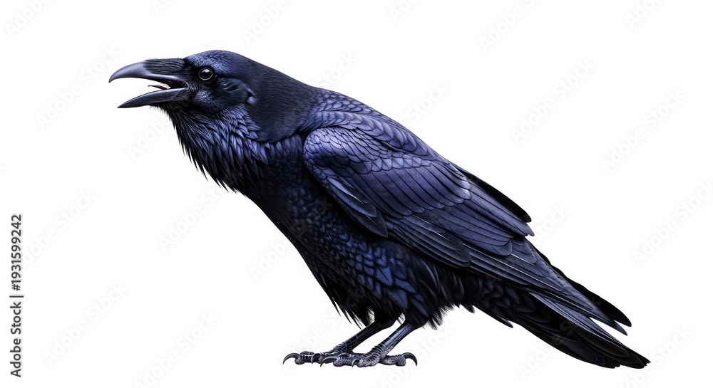 A detailed close-up of a black raven perched with its beak open and wings slightly spread, showcasing its glossy feathers and intelligent eyes #1931599242