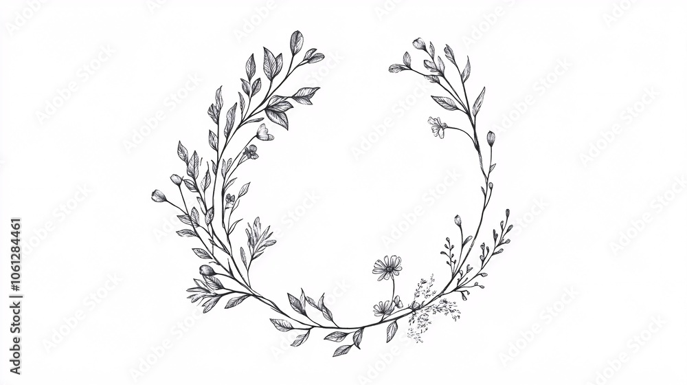 107.A detailed, hand-drawn floral circle frame featuring fine branches, dainty leaves, and small blossoms, arranged symmetrically in a wreath-like design, offering a minimalist and sophisticated look. #1061284461