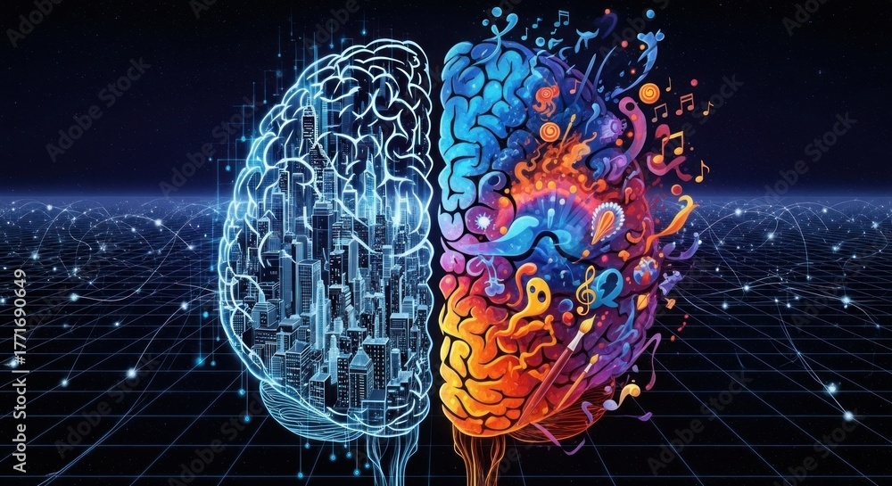 A digital illustration of a split brain with one side representing logic and the other side representing creativity. #1771690649