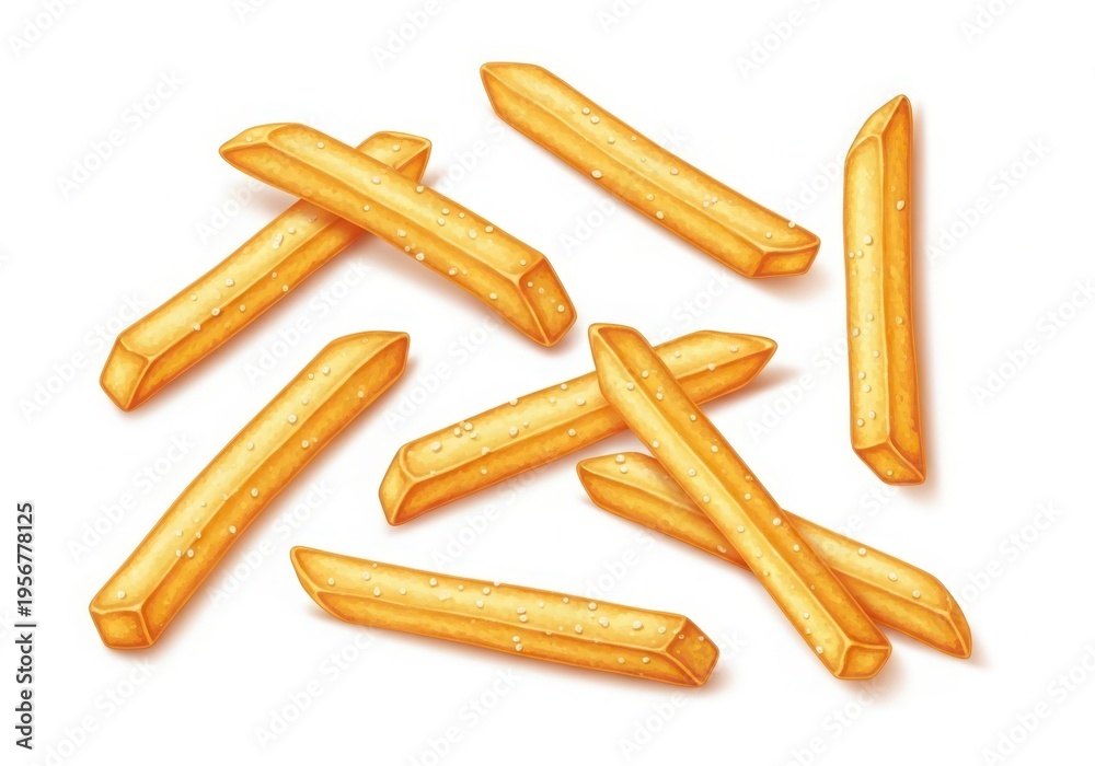 A digital illustration of crispy golden french fries scattered randomly on a plain white background #1956778125