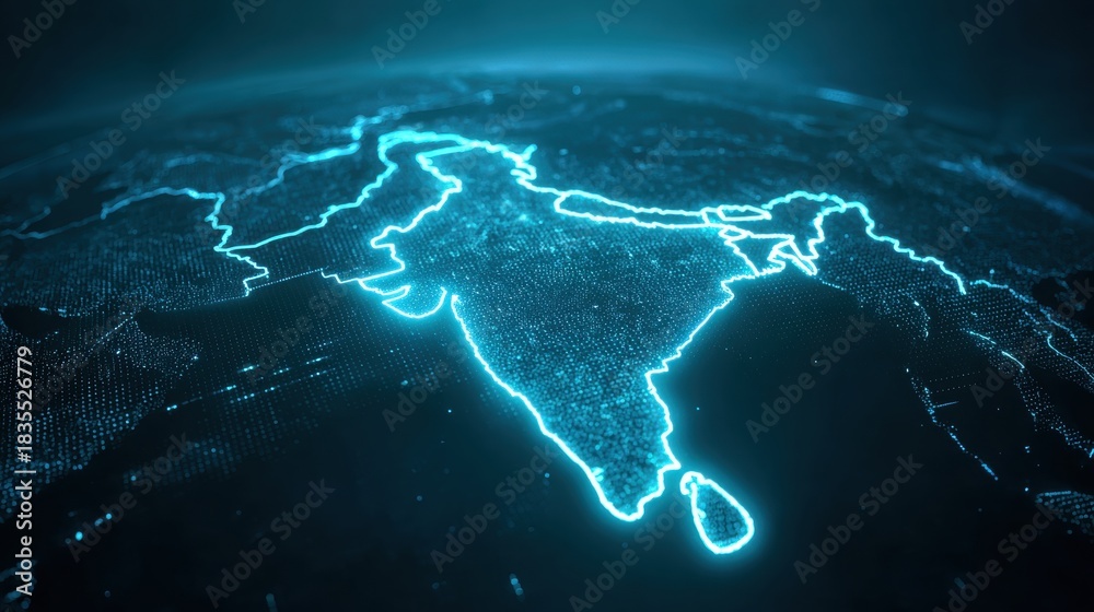 A digital rendering of the Indian subcontinent with a glowing blue outline against a dark background. #1835526779