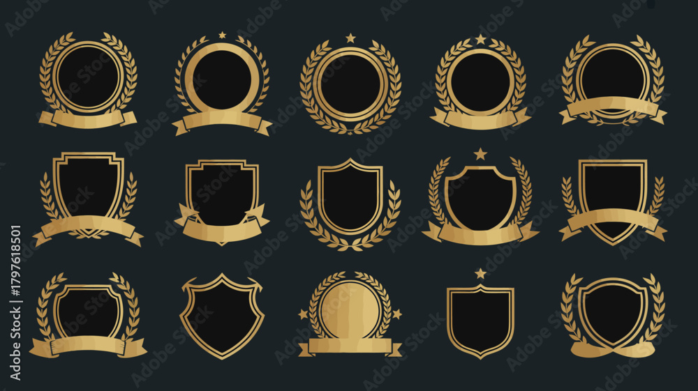 A diverse collection of elegant golden badges, emblems, heraldry, and shield designs adorned with laurels and ribbons, perfect for premium branding and recognition. #1797618501