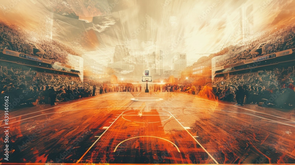 a double exposure an empty basketball court and a basketball stadium full of cheering fans #839140162