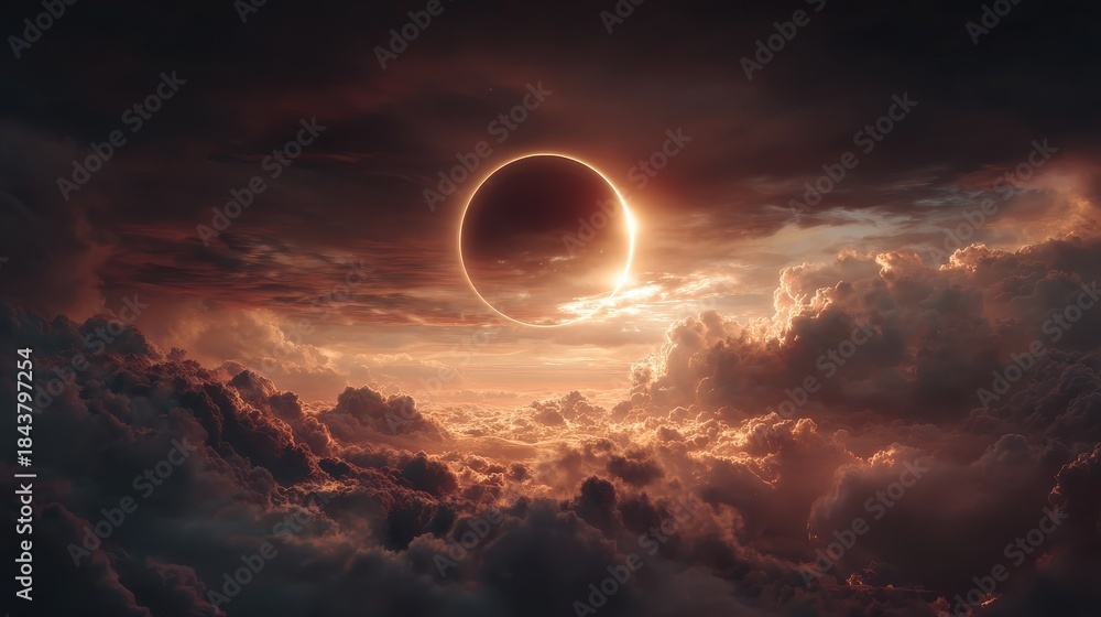 a dramatic cosmic solar eclipse set against a glowing celestial sky capturing the shadowed sun radiant corona and deep space atmosphere in a surreal astronomical moment #1843797254