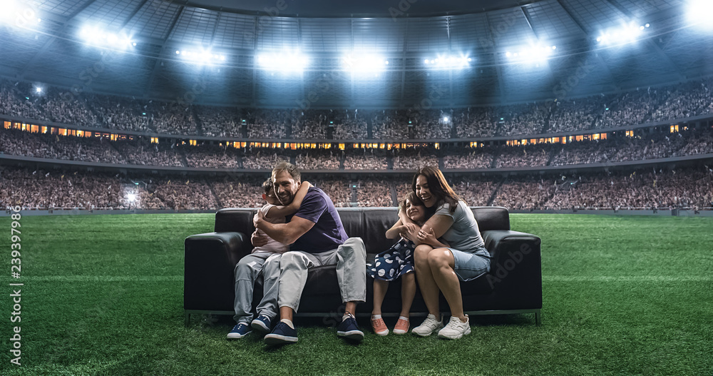 A family is watching a soccer moment, sitting on the couch located in the middle of the soccer stadium. #239397986