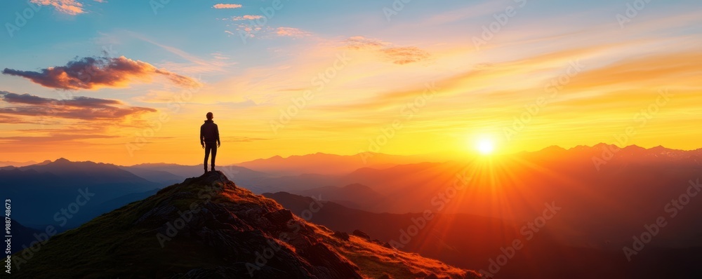 A figure standing on a hilltop under a rising sun, gazing at a clear horizon, symbolizing hope and a visionary new beginning new beginnings, hope vision #988748673