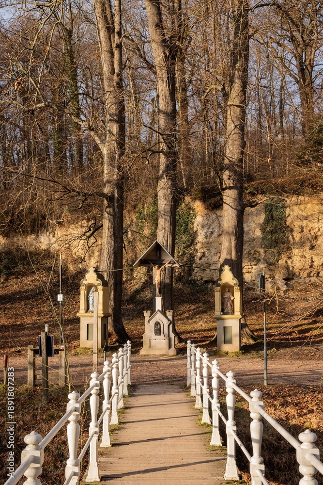 A footpath bridge leading to three statues called De Drie Beeldjes aan de Geul in Dutch. nature countryside area in Limburg the Netherlands next to Kasteel Schaloen #1891807283