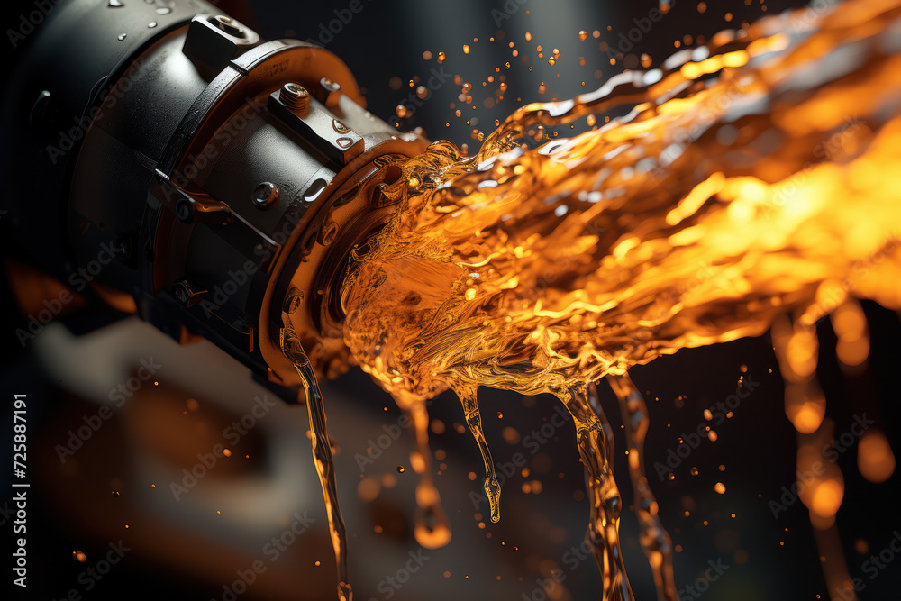 A fuel nozzle suspended mid-air, with liquid fuel droplets forming a dynamic pattern below, symbolizing the energy and fluidity of modern fuel systems. Generative Ai. #725887191
