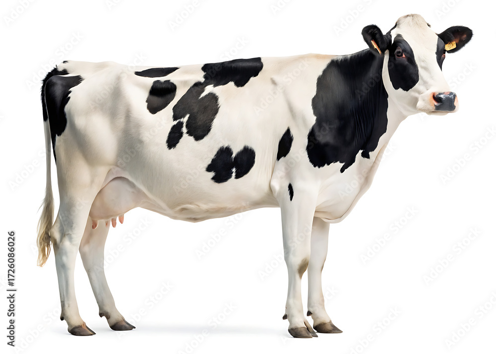 A full body side view of a black and white holstein cow standing on a white background in a studio shot #1726086026
