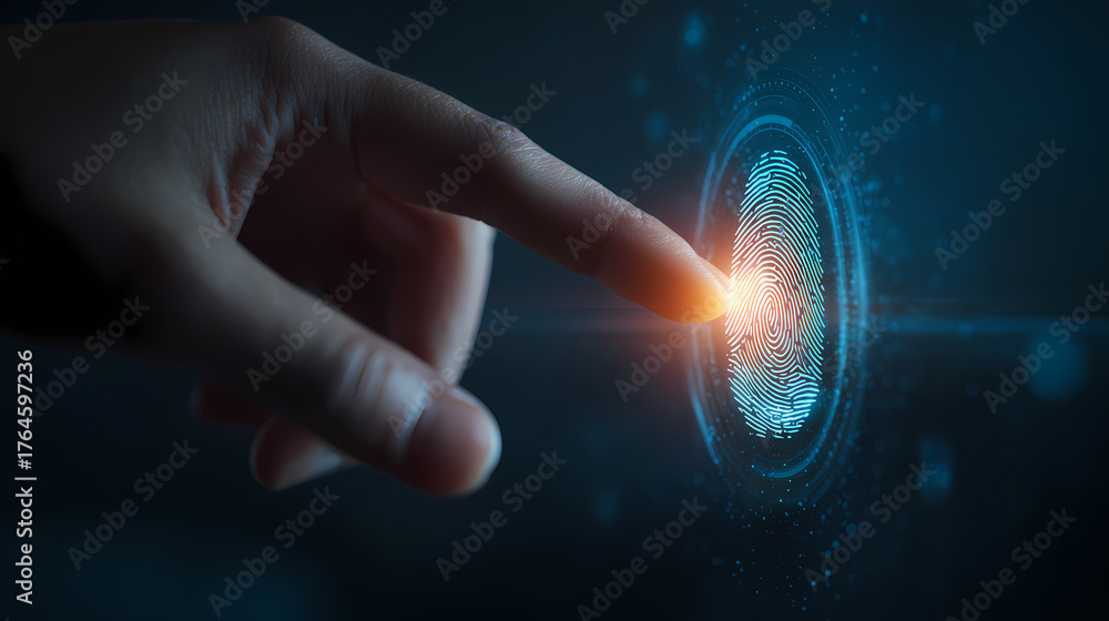 A futuristic illustration showcasing the concept of biometric identification with a fingertip touching a glowing fingerprint scan. This represents digital security and advanced technology #1764597236