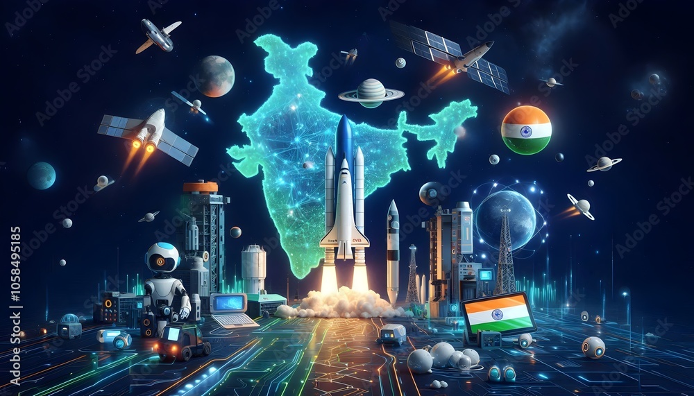 • #1058495185 A futuristic vision of India’s achievements in space and science, like ISRO’s missions and startups. Rockets and satellites launch from a glowing map of India.