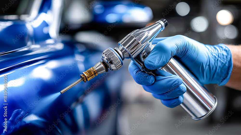 A gloved hand of a car painter using a spray gun sprays blue paint onto a car body. The painter is painting a car part blue. #1839048055