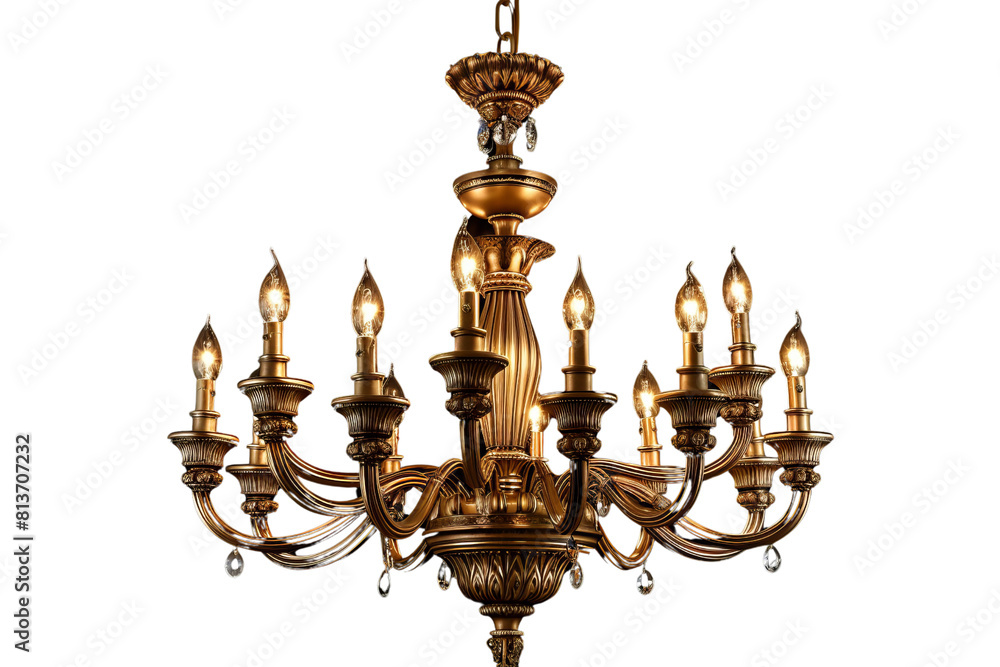 A gold chandelier with nine lights hanging from it #813707232