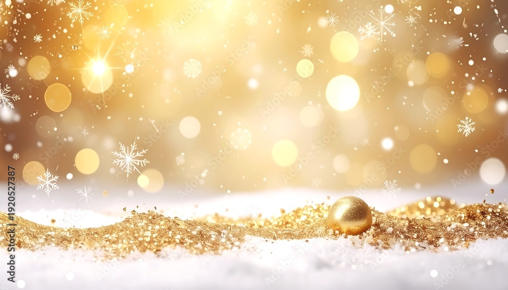 A golden Christmas theme with a snowy base, glittering grains, sparkling lights, and bokeh effects. A single golden ball glistens #1920527387