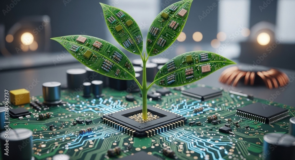 A green plant growing from a computer chip on a circuit board. #1781062737