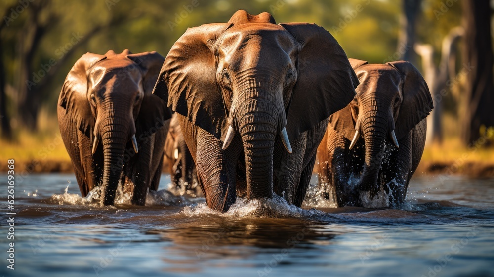 A group of African Elephants (Loxodonta africana) cooling off in Botswana's Okavango Delta, their massive bodies and flapping ears a majestic sight against the water. #626169368