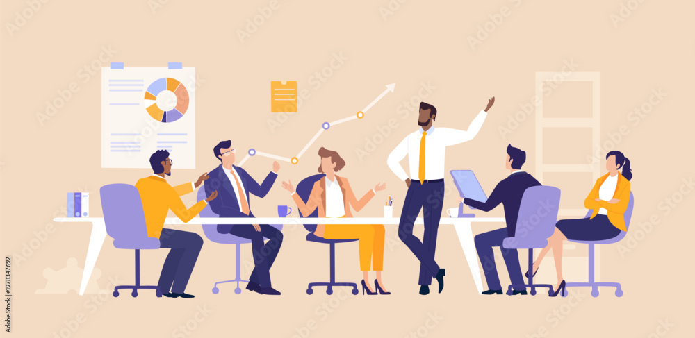 A group of business professionals engaged in conversation and information sharing, representing communication, teamwork, collaboration, networking, and knowledge exchange #1978347692