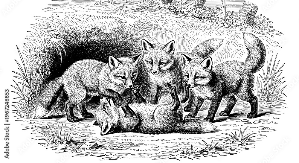 A group of curious young foxes gathered around a fallen companion in a natural setting #1967246853