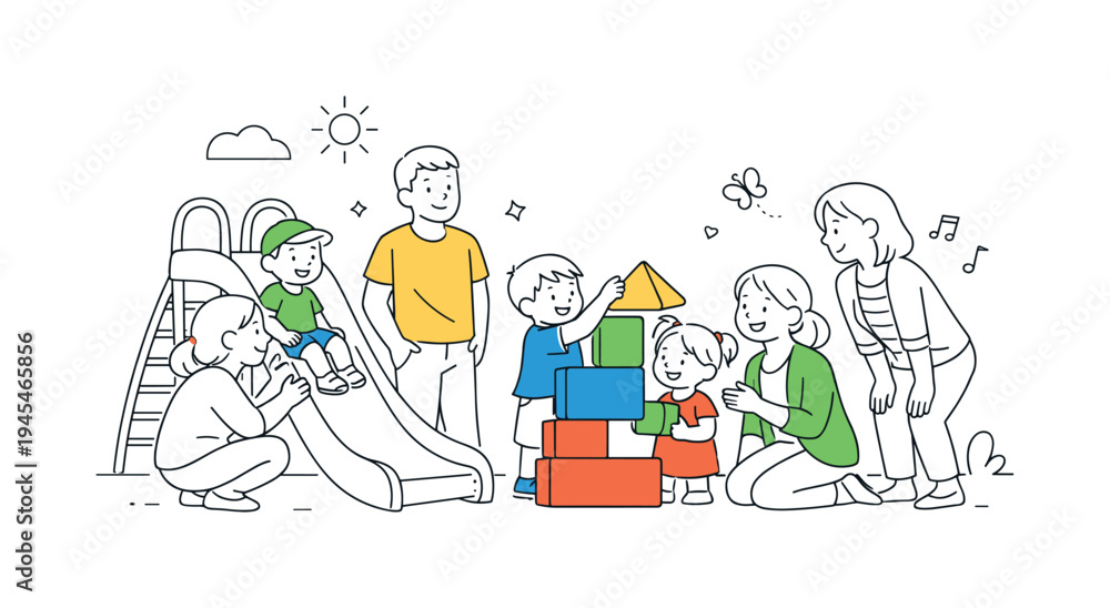 A group of parents and children enjoying a warm morning at a modern kindergarten playground while teachers supervise daily activities, gathered around a large simple slide and a colorful toy #1945465856