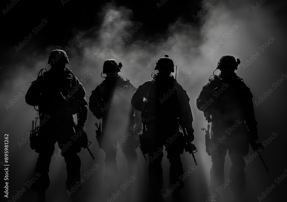 A group of special forces soldiers dressed in black, silhouetted against a smoky background, creating a dramatic and intense scene #895981262