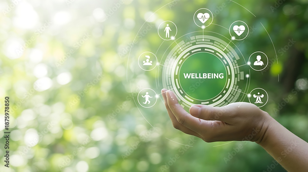 A hand holding a glowing green wellbeing icon surrounded by wellness symbols in a serene natural setting #1875978850
