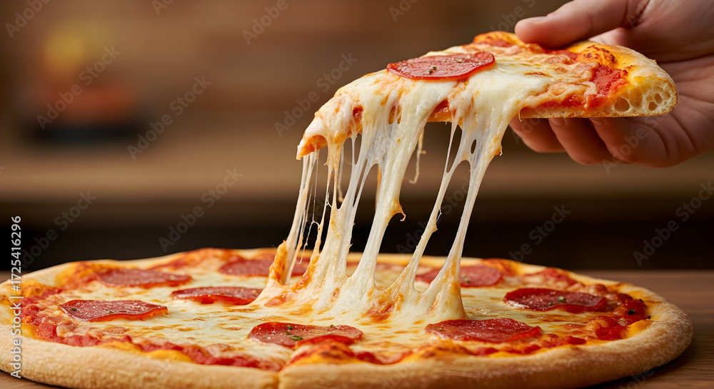 A hand pulling a slice of hot, cheesy pizza, with a long cheese pull #1725416296
