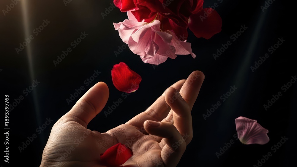 A hand reaching towards falling rose petals in a dramatic, dark scene #1893797763