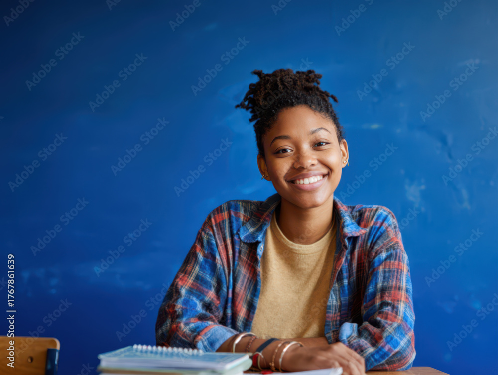 A happy african american university female student sitting in a chair, books can be seen placed on the desk #1767861639