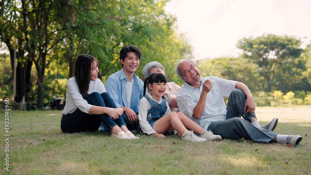 A happy multigenerational Asian family enjoys a sunny day in a lush park. Grandparents, parents, and a young girl smile together on the grass, Authentic lifestyle and bonding moments #1933740960