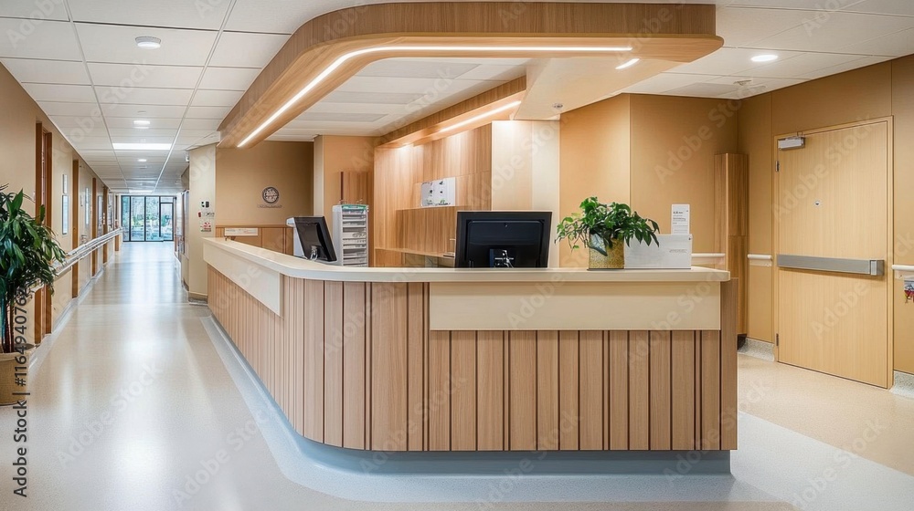 A hospital nurse station with a front desk- conveying a sense of calm order. #1164940762