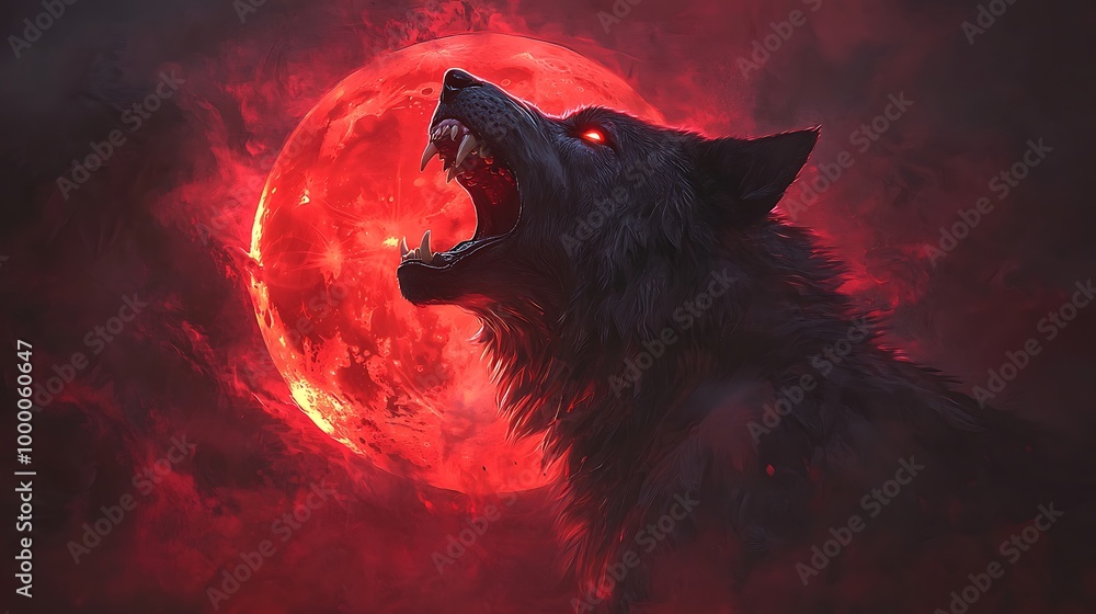 A howling wolf is framed against the blood-red moon, an image of nighttime power. #1000060647