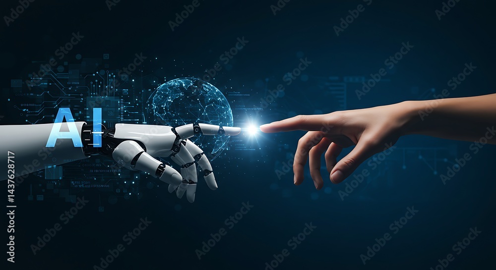 A human fingertip gently touches the glowing fingertip of a robotic hand, symbolizing the intersection of artificial intelligence and humanity against a digital backdrop. #1437628717