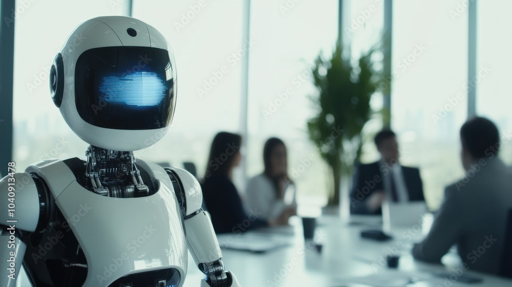 A humanoid robot with a built-in holographic display, presenting information in a modern, high-tech boardroom during a business meeting #1040913478