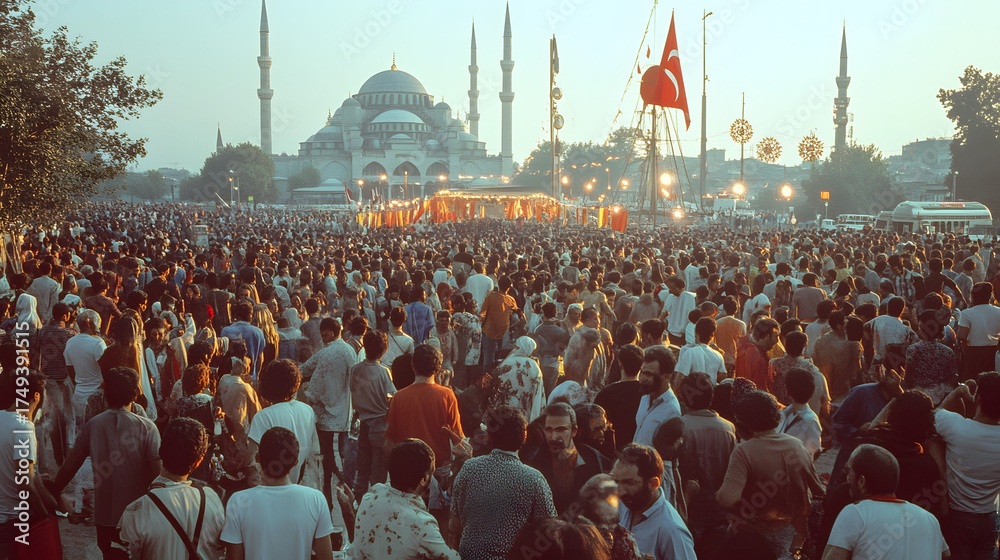 A large crowd of people gathers in front of the yeni cami mosque in istanbul, turkey, during a religious event on a sunny day with flag #1749391515