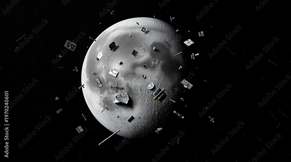 A large moon with debris and space junk floating in orbit around it #1970240601