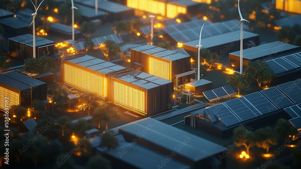 A large-scale renewable energy farm with solar panels and wind turbines connected to massive grid storage batteries. #1081637182
