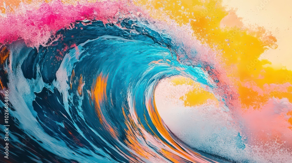 A large wave with a vibrant blue, orange, and pink color palette crashes in the ocean. #1026484986
