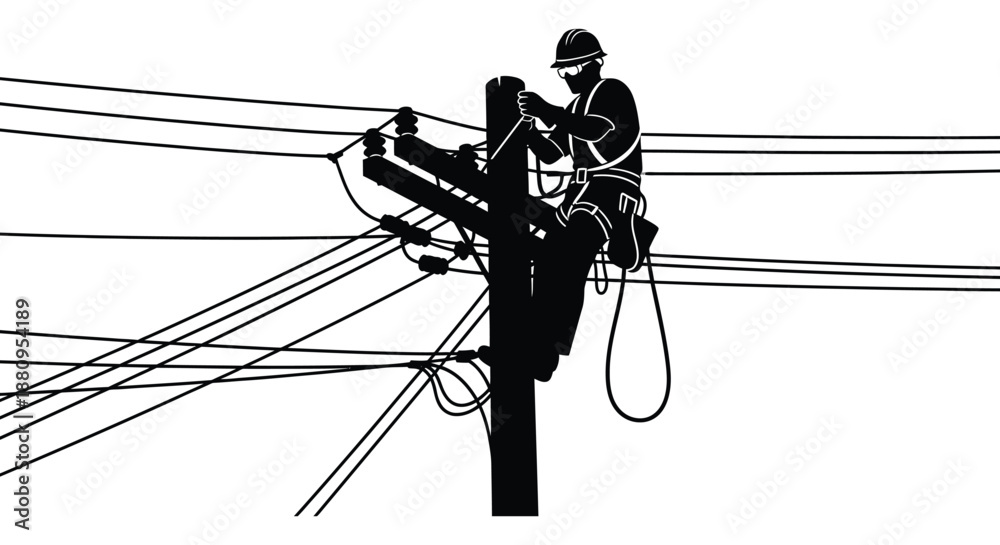A lineman skillfully working on high voltage power lines while suspended from a bucket truck a striking silhouette high quality professional #1880954189