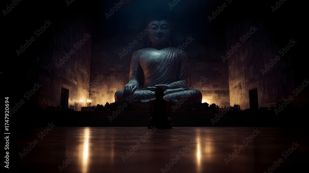 A lone figure kneels in prayer before a monumental Buddha statue in a dimly lit atmospheric temple #1747920694