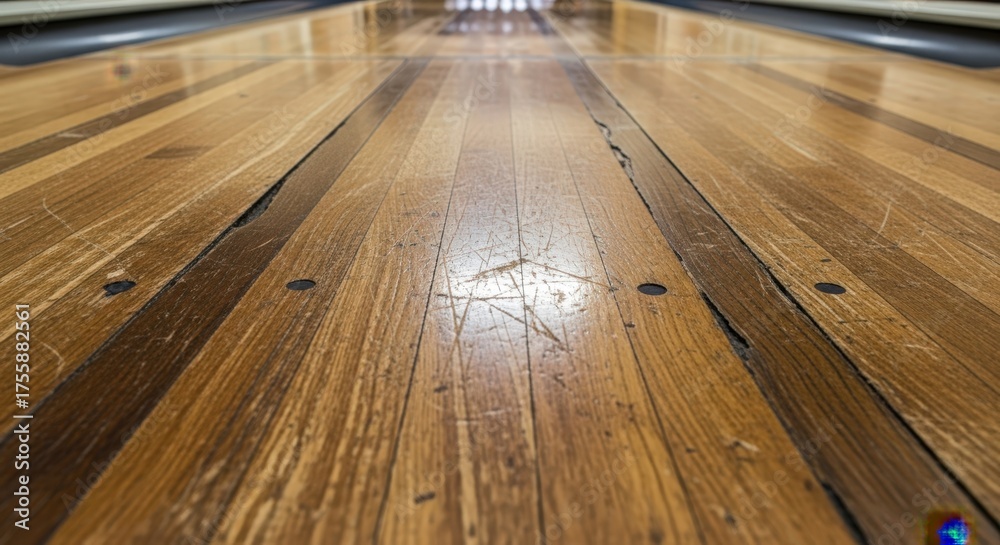A long wooden bowling lane with visible wear and tear leading towards bowling pins in a brightly lit bowling alley #1755882561