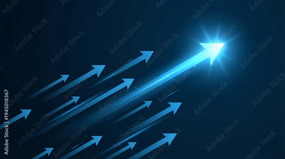 A luminous blue arrow leads a group of upward-moving arrows, symbolizing exceptional business leadership, market dominance, and outstanding success in a competitive environment. #1945018367