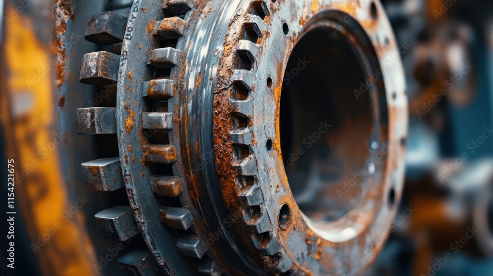A macro shot of a bearing that shows signs of corrosion and wear with adjacent analysis software projecting degradation timelines and mitigation strategies. #1154221675