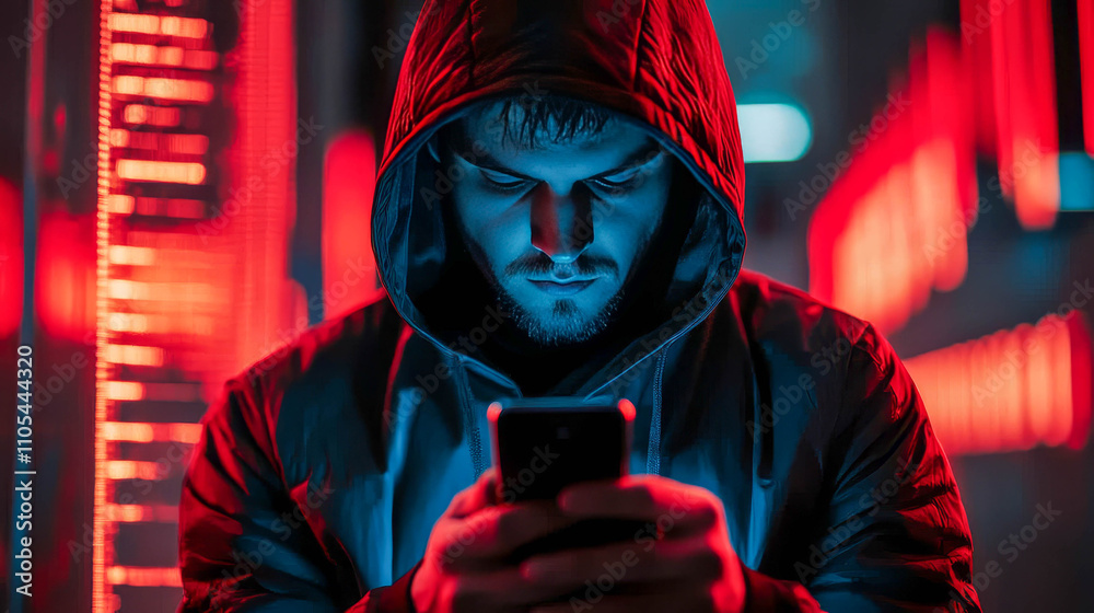 A man in a dark hood is looking at the phone. The light from the phone creates a small aura around his face, making his image mysterious. The atmosphere of mystery and secrecy. #1105444320