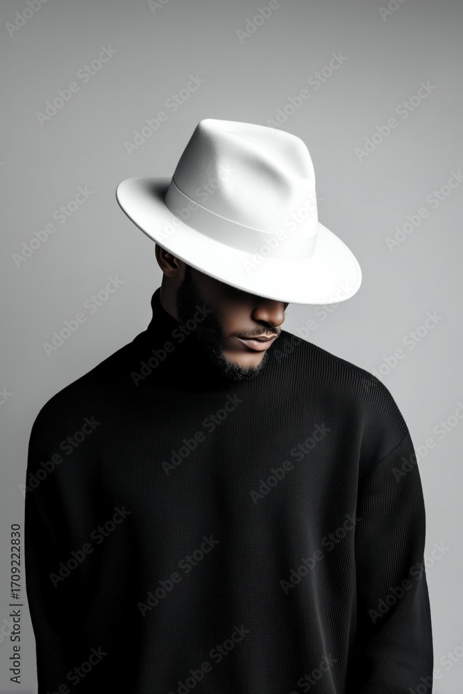 A man wearing a white hat and a black turtleneck mockup, looking down against a gray background #1709222830