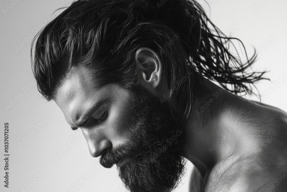 A man with long hair and a full beard poses thoughtfully against a plain background in a serene black and white portrait #1037071205