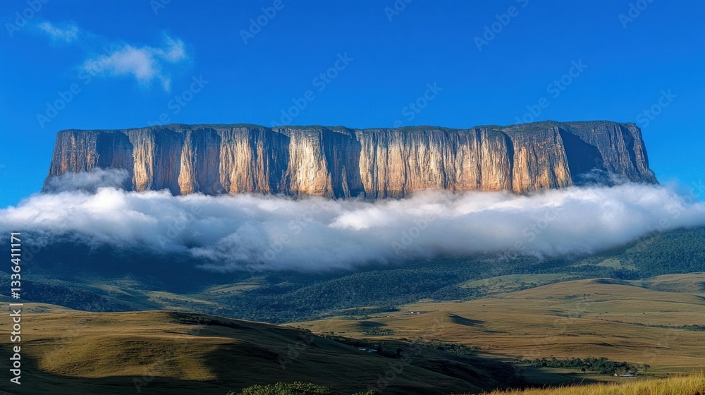 A massive flat topped mountain rises above the clouds and landscape #1336411171