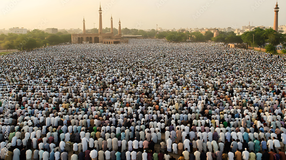 • #1749392231 A massive gathering of muslim worshippers in lahore, pakistan, offering prayers in an open field with badshahi mosque in the background at dawn