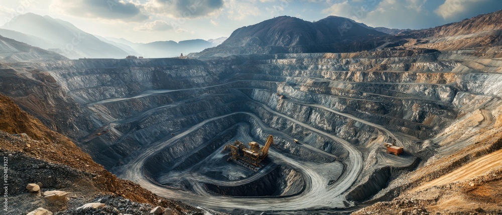A massive silver mine stretching across a rugged landscape with heavy machinery and processing plants #1024829327