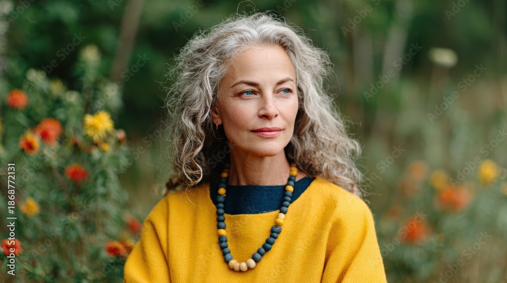 A mature woman with beautiful curls sits peacefully amidst vibrant wildflowers, radiating confidence and joy, embodying the tranquil beauty of nature and life's wisdom. #1868772131