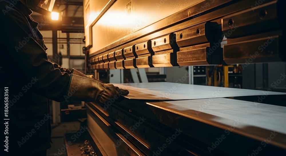 A metalworker in protective gloves feeds a sheet of metal into a large industrial press brake machine in a factory setting. #1806583161